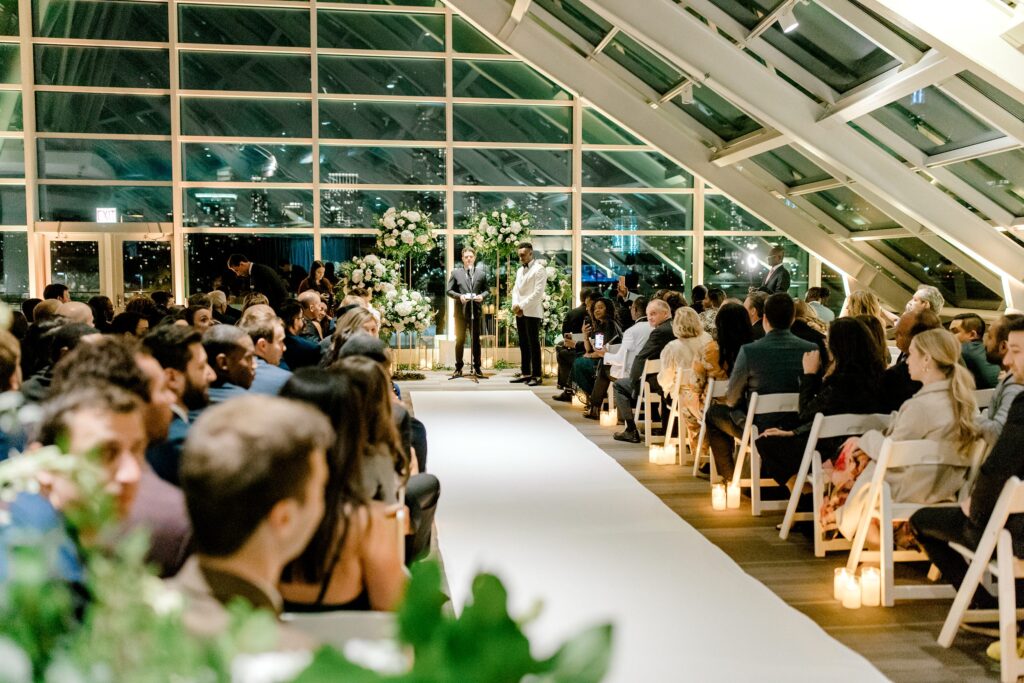 The wedding ceremony at Adler Planetarium was both intimate and breathtaking. With Lake Michigan nearby and the Chicago skyline in full view, the setting added a sense of grandeur without overwhelming the emotion of the moment. Iris and Lexi exchanged vows surrounded by their closest family and friends, creating an experience that felt heartfelt and grounded.
